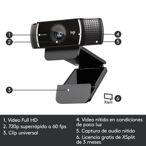 Graba y haz streaming de videos totalmente naturales. La C922 tiene una lente de cristal con enfoque automático y un campo visual diagonal de 78°. La resolución de streaming Full HD captura todos los detalles, el brillo, los colores naturales y ofrece video fluido a 1080p/30 fps (720p/60 fps en HD). Usa el software Capture para funciones de zoom, panorámica y edición.