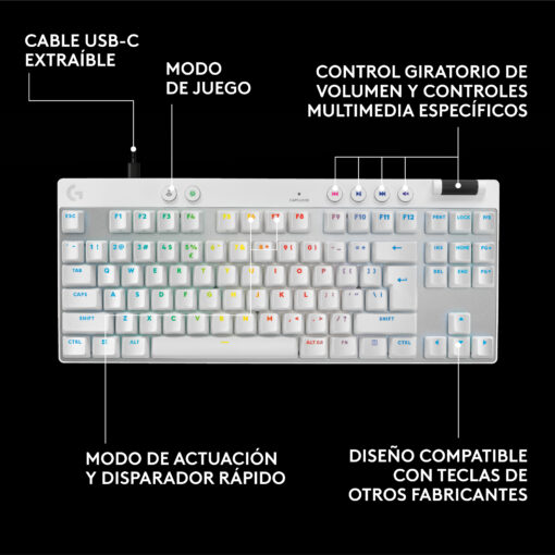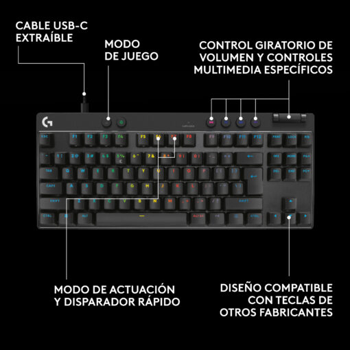 Diseñado para que los profesionales ganen campeonatos, con control de modo de juego, teclas de PBT de doble moldeado, distribuciones de teclado estándar para compatibilidad con 3P y opciones de conectividad LIGHTSPEED, Bluetooth y USB.